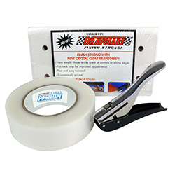 The Banner Ups® standard 4AS-5 starter kit is designed as an ultra low cost and easy way to use and test the Banner Ups® system. Each case includes 5 kits of: 1 roll 1.5" x 36 yd. clear, single-sided PowerTape® , a pack of 100 BravoTabs® , and 1 EZPunch™ tool. Each kit has everything you need to make up to 25 banners Faster, Stronger, and easier than using grommets and folding and sewing hems. With the Banner Ups® system you can make a banner in just 3 minutes. Just stick the BravoTabs® along the banner edge or corner, apply the clear PowerTape® over the tabs, punch your hole & hang your banner.