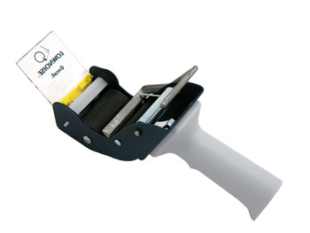 APLICATR 5014 is a low noise mousetrap carton sealing dispenser for up to 2" wide rolls. It has a blade cover and rubber roller with static cling strip to keep rolls in "ready to use" position. US Patent # 6641081